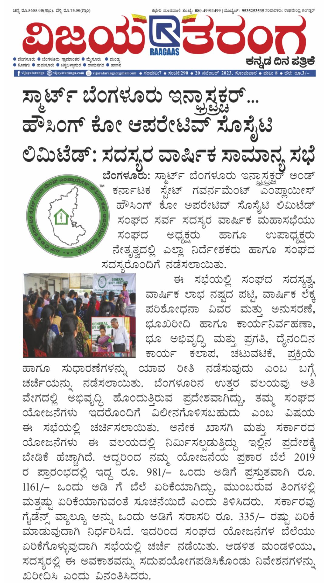 ಸ್ಮಾರ್ಟ್ ಬೆಂಗಳೂರು ಇನ್ಫ್ರಾಸ್ಟ್ರಕ್ಚರ್ ಅಂಡ್ ಕರ್ನಾಟಕ ಸ್ಟೇಟ್ ಗೋವೆರ್ನ್ಮೆಂಟ್ ಎಂಪ್ಲಾಯೀಸ್ ಹೌಸಿಂಗ್ ಕೋ ಅಪರೇಟಿವ್ ಸೊಸೈಟಿ ಲಿಮಿಟೆಡ್ ಸಂಘದ ಸರ್ವ ಸದಸ್ಯರ ವಾರ್ಷಿಕ ಮಹಾಸಭೆಯನ್ನು ಸೆಪ್ಟೆಂಬರ್ ತಿಂಗಳಲ್ಲಿ ಸಂಘದ ಅಧ್ಯಕ್ಷರು ಹಾಗೂ ಉಪದಕ್ಷ್ಯರ ನೇತೃತ್ವದಲ್ಲಿ ಸಂಘದ ಎಲ್ಲಾ ನಿರ್ದೇಶಕರ ಜೊತೆಯಲ್ಲಿ ಪ್ರಸ್ತುತವಿದ್ದ ಸಂಘದ ಸದಸ್ಯರೊಂದಿಗೆ ನಡೆಸಲಾಯಿತು.
